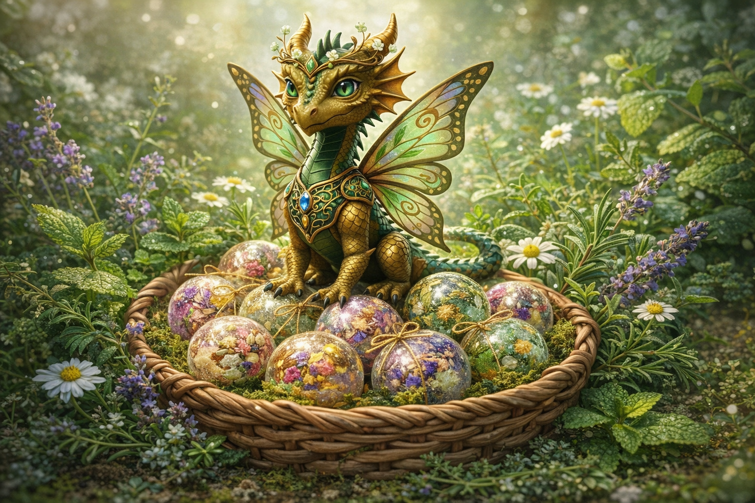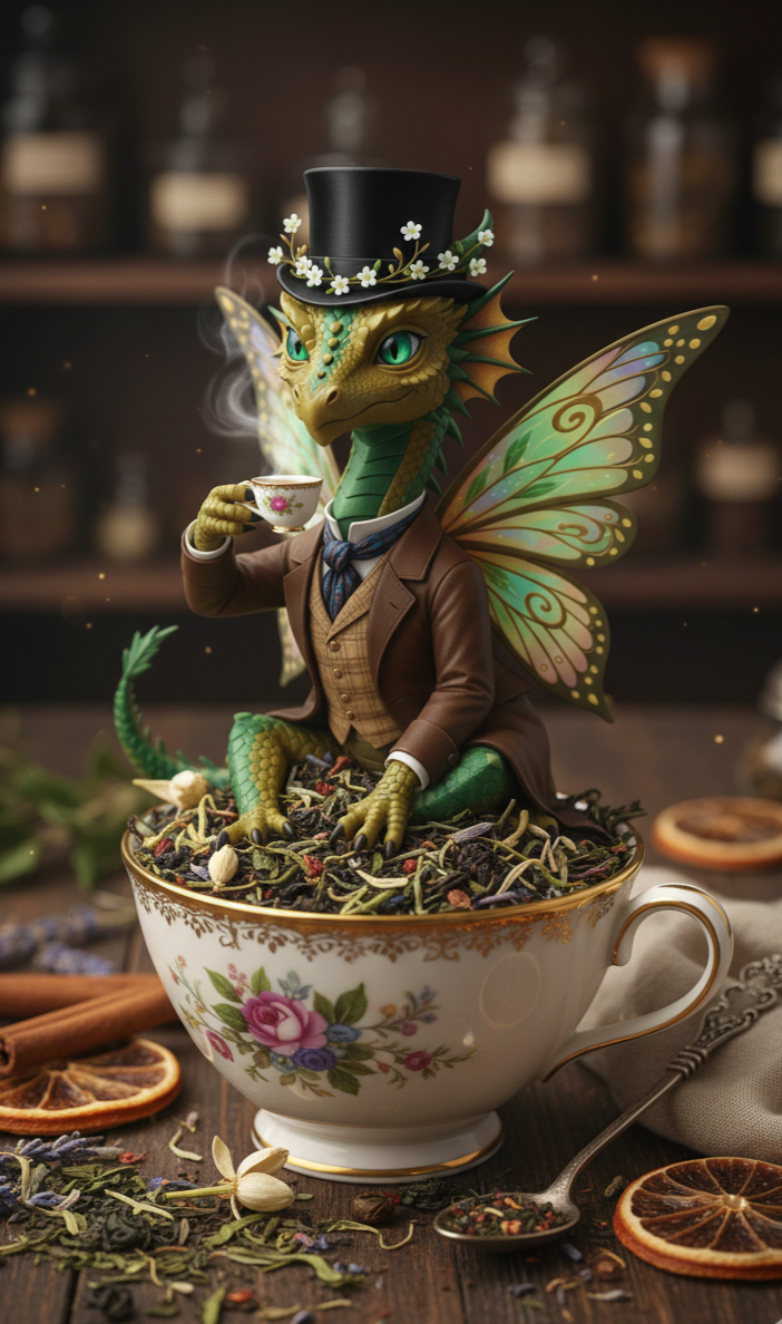 Within the gold seal of our sanctuary drifts Ozmi, a fairy dragon whose wings shimmer like the morning mist over a tea garden. Ozmi is the keeper of the Ozmi Blooms - those rare “tea bombs” that hold the power of transformation. In folklore, the Dragon (the “Long”) is often the protector of a great treasure.